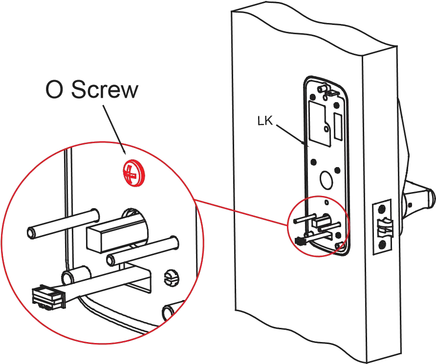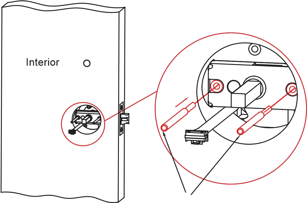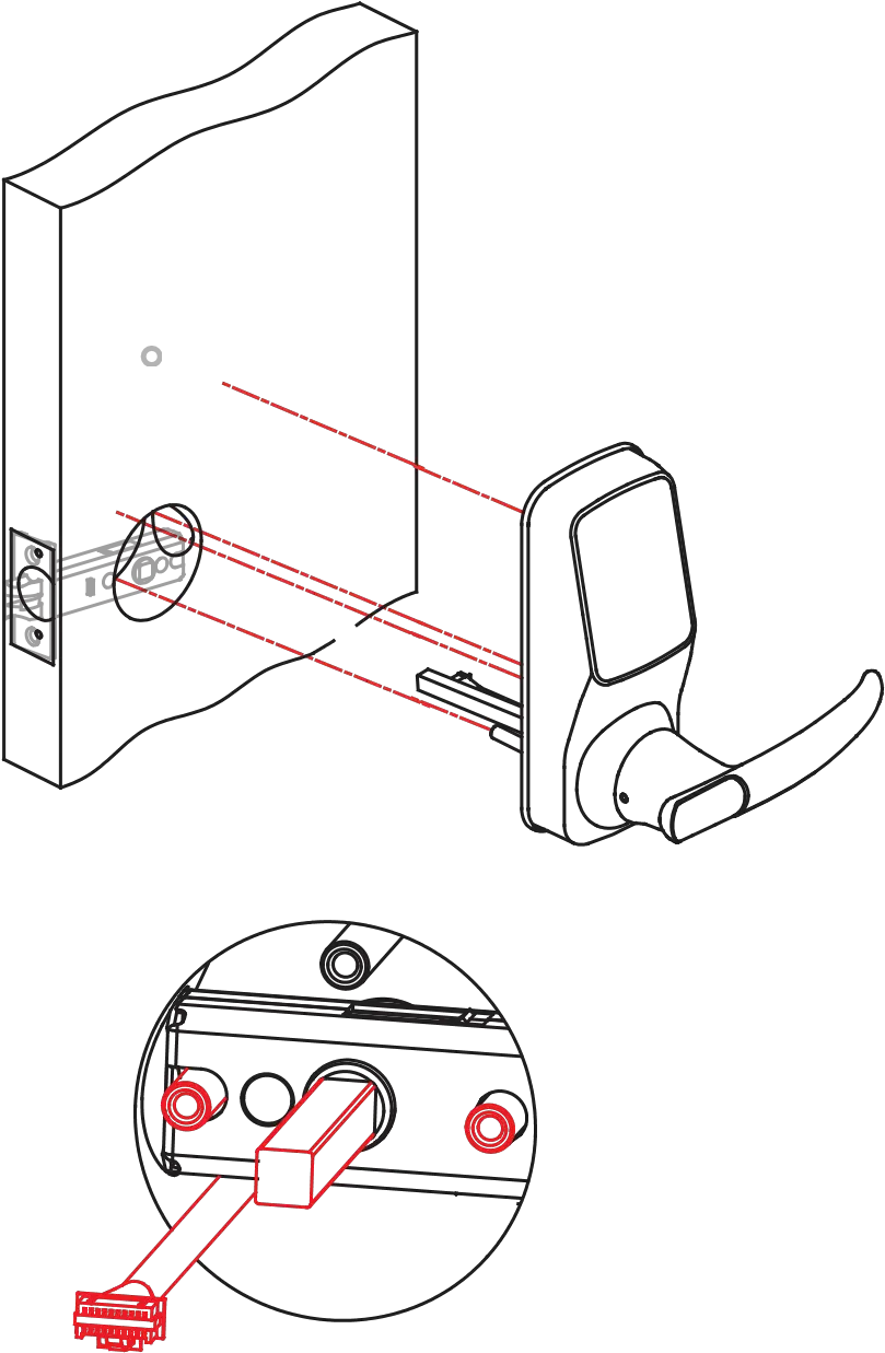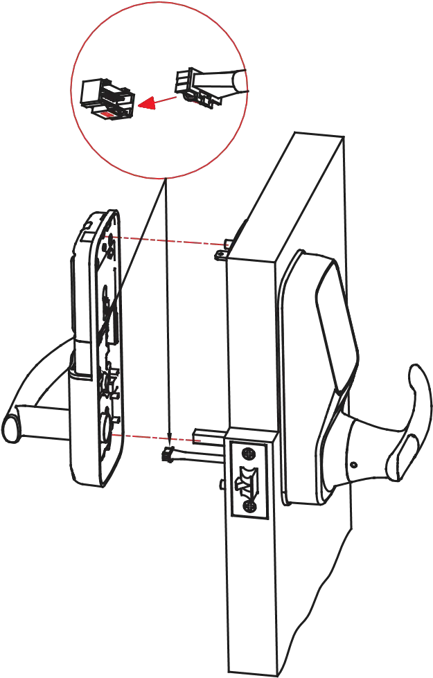 6.5 Plug the cable that is coming through the door into the interior lock. Make sure you match the direction of the plug correctly and matching the red side of the plug with the red side on the lock.