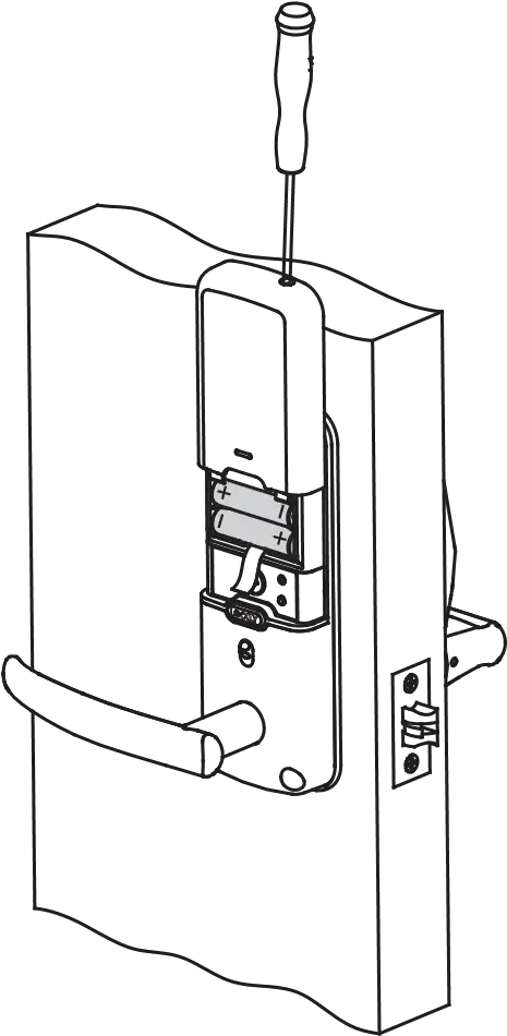 6.8 Insert 4 AA batteries into the lock by matching the positive (+) and negative (-) orientation markings on the batteries to the battery chamber. Secure the battery cover by sliding the cover over the lock and turning the screw clockwise on top until tight.
