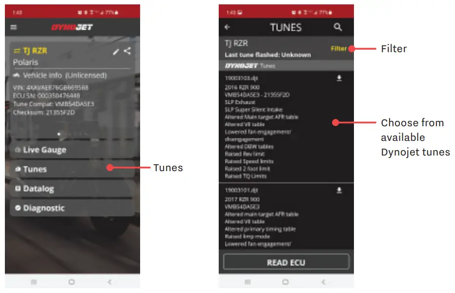 - Select a tune file (.djt) from the list of available Dynojet Tunes or press Filter to filter the list of tunes.