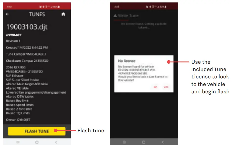 - Press Yes to use the included Tune License to lock the Power Vision 4 to this vehicle and flash the tune. Do not turn off the key switch or disconnect the Power Vision during the flash.