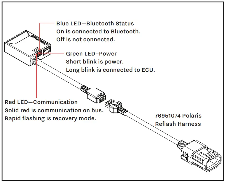- Green LED—Power. Short blink is power; long blink is connected to ECU.