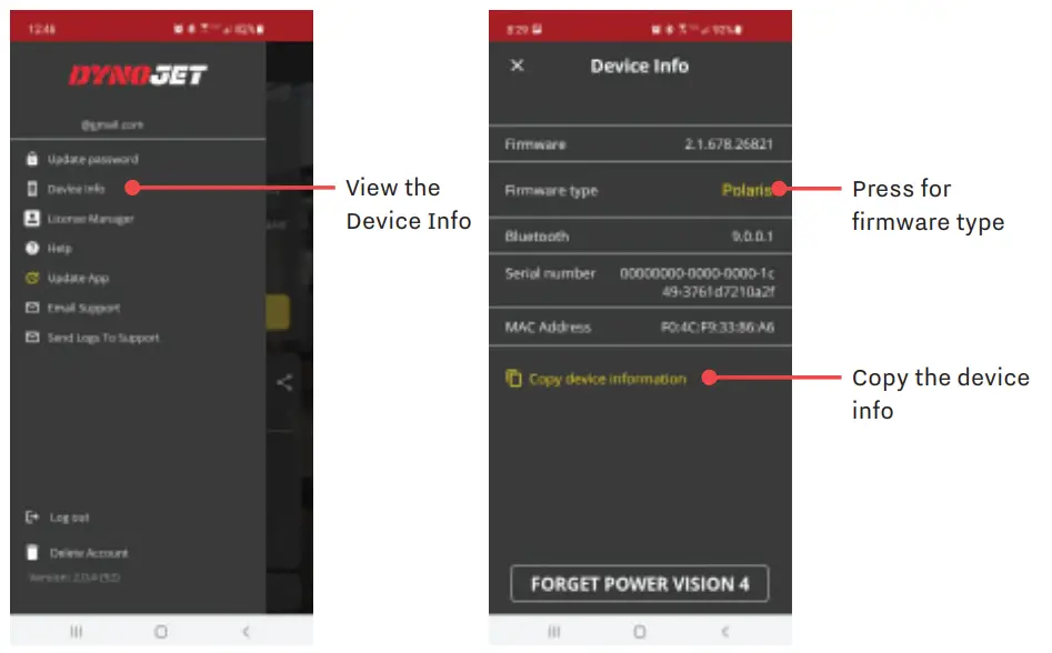 Device Information allows you to view the Power Vision 4 firmware version, serial number and address, and copy the device information if needed, while Firmware type allows you to toggle between brands of firmware.