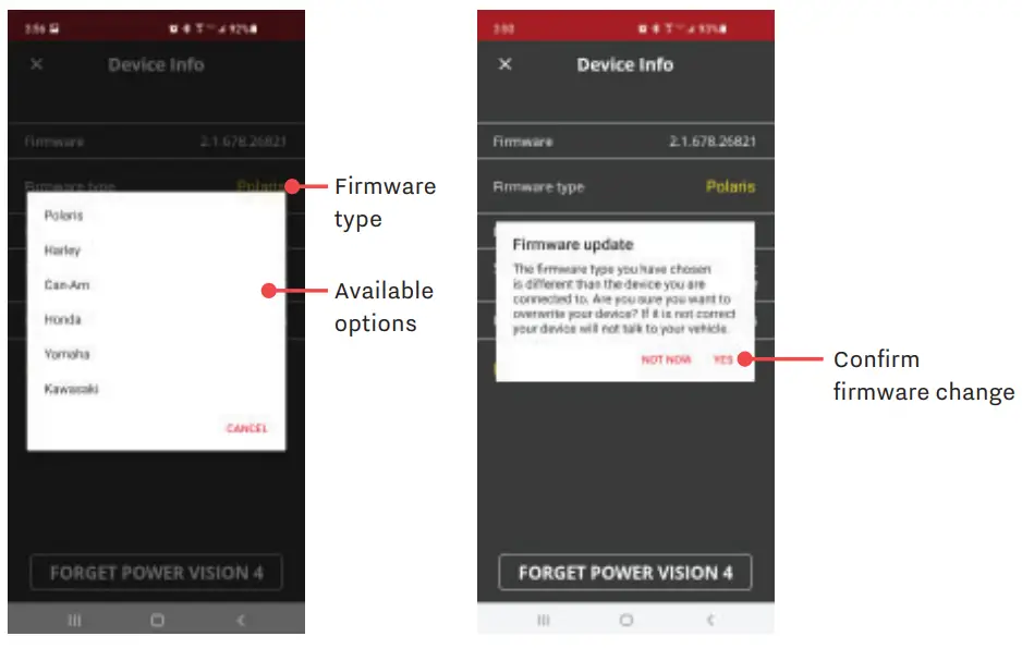- Every time you connect to the Power Vision 4, the device automatically checks for new firmware. If newer firmware is found, the Power Vision 4 will ask you to update the device.