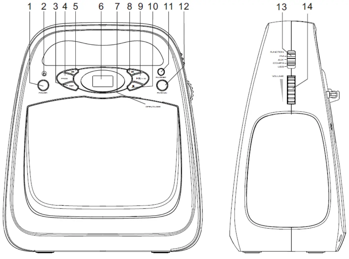 - Adjust the “VOLUME” control (14) to increase or decrease the volume level