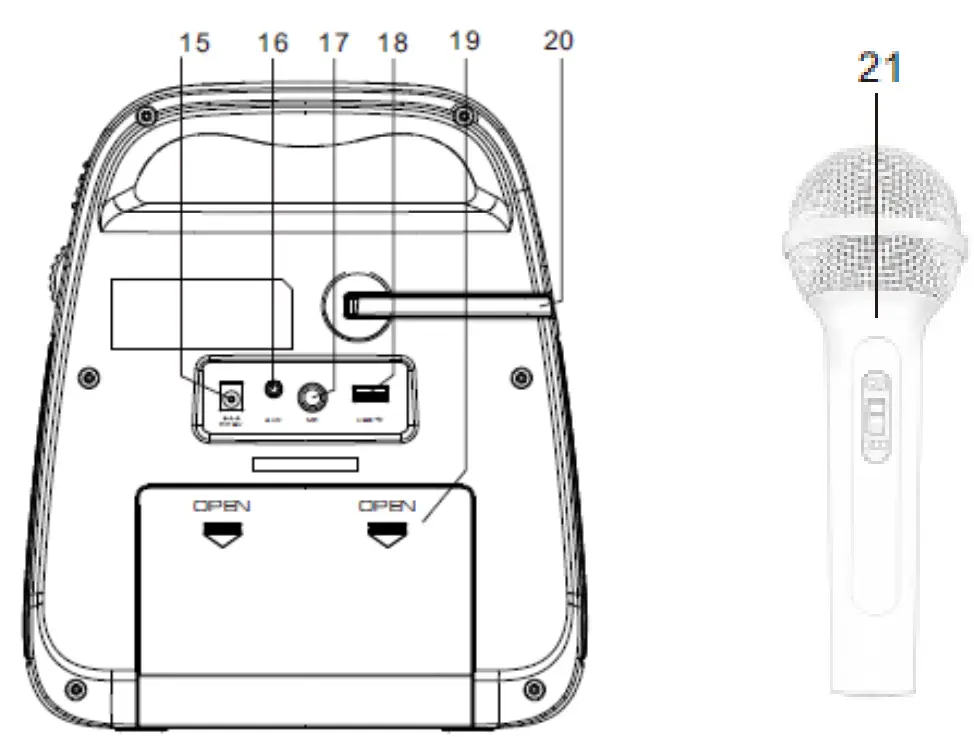 - Plug the provided microphone into “MIC” jack (17).