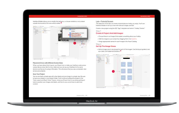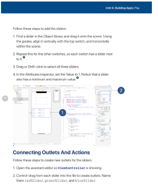instructions with images and videos guide students through all the steps of building an app in Xcode.