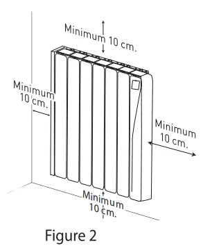 The product works by means of natural air convection (Figure 1). In order to achieve optimal functioning and an even distribution of heat, the lower part of the product, once mounted on the wall, must be at least 10-12cm from the floor, and 30cm at the most. As for the sides and above, a minimum distance of between 10-12cm must be left from any wall or brickwork in order for it to function correctly (Figure 2).