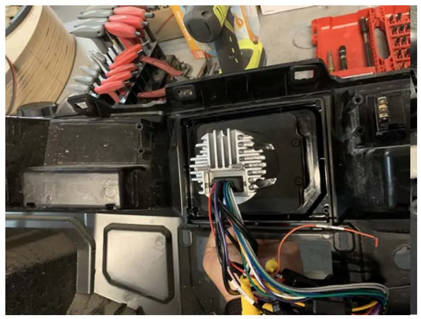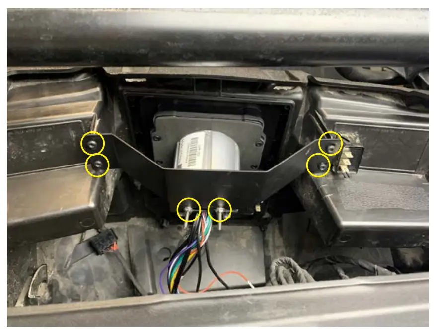 - Install two double threaded bolts in back of radio with 7mm wrench