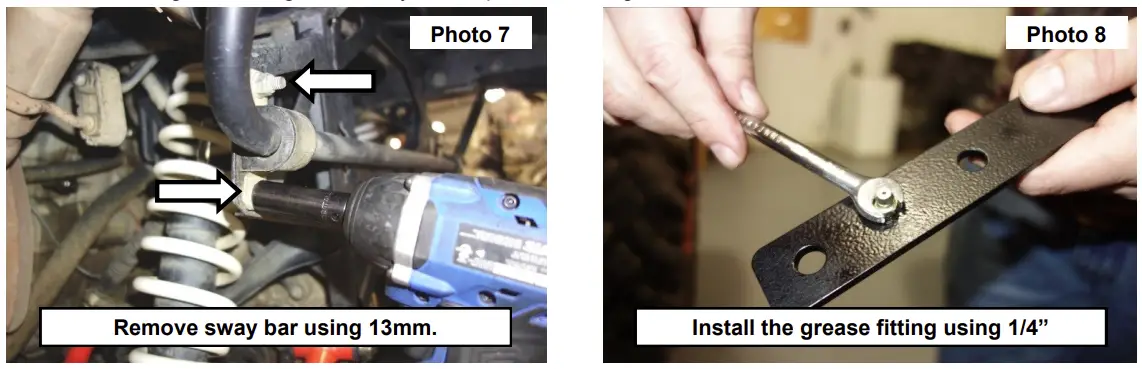 - Install the 1/4″ grease fitting in the sway bar drop bracket using a 1/4″ wrench. See Photo 8.