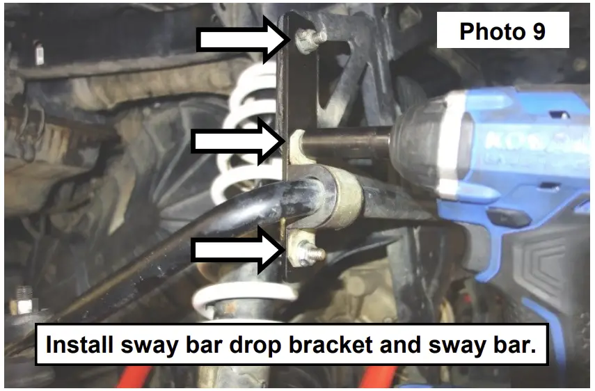 - Install the sway bar drop bracket (Photo c from Page 2) and sway bar using supplied 5/16″-18×1″ bolt, flange nut, and washer on the top hole and stock hardware for the sway bar. Tighten the 5/16″ hardware using a 1/2 socket/ wrench. See Photo 9.