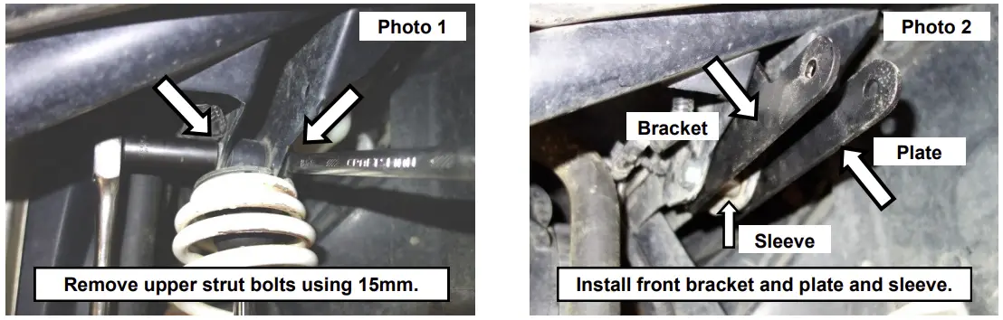 - Install the front bracket (Photo a on page 2) toward the front of the upper strut mount and the front plate (Photo b on page 2) toward the rear of the upper strut mount using the supplied 10MM-1.5x60MM bolts, nuts, washers and the 0.75″x1″ sleeve using two 16mm socket/wrenches. See Photo 2.