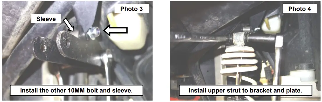 - Install the upper strut into the bracket and plate using the stock hardware and 15mm socket/wrenches. See Photo 4.