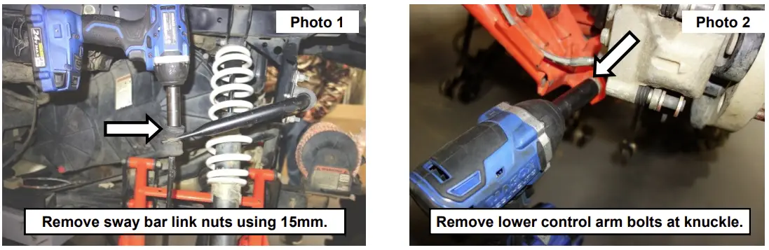 - Remove the sway bar link nuts using a 15mm socket/wrench and let links hang loose. See Photo 1.