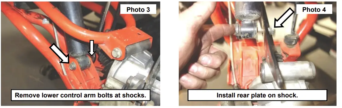 - Install the rear plate (Photo d from Page 2) toward the front of the vehicle one the shock using stock hardware.
