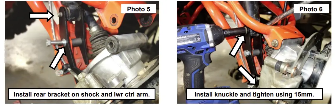 - Install knuckle using stock hardware and tighten the shock and knuckle using 15mm socket/wrench. See Photo 6.