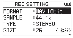 | Playback | WAV, 44.1kHz, 16-bit | About 16.5 hours | Using built-in speaker |