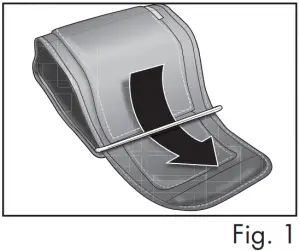 - Keeping the words on the inside of the cuff, thread the end of the cuff through the metal bar, Fig 1. The end of the cuff should be able to fold over onto itself for securing via the hook and loop closure, Fig 2.