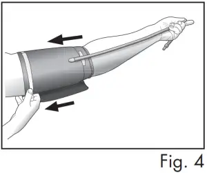 - Slide the cuff cylinder onto your left arm and align the air hose over the main artery on the inside of your arm, Fig 3. For proper positioning, the tube should follow the inside length of the arm, Fig 4.