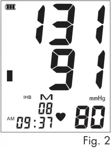 YOU CAN STOP THE INFLATION OR DEFLATION PROCESS AT ANY TIME BY PRESSING THE POWER START/STOP BUTTON. - When the measurement is complete, your blood pressure measurement and pulse will display simultaneously on the screen, Fig 3.