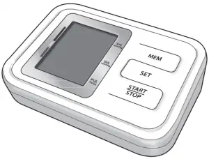 - If you experience any discomfort or an abnormality occurs, stop using the device immediately; to stop the device during operation, press the START/ STOP button and the cuff will automatically deflate.