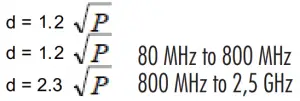 | For transmitters rated at a maximum output power not listed above, the recommended separation distance d in meters (m) can be determined using the equation applicable to the frequency of the transmitter, where P is the maximum output power rating of the transmitter in watts (W) according to the transmitter manufacturer. NOTE 1 At 80 MHz and 800 MHz, the separation distance for the higher frequency range applies. | |||