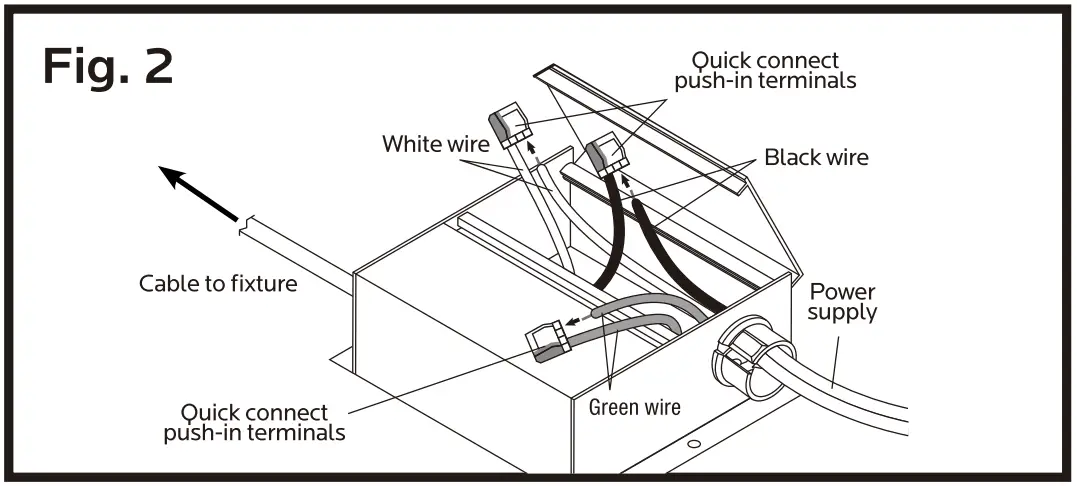 - Using wire nuts, connect green ground wire of cable to green wire on box. Connect black wire of cable to black wire of box. (Fig. 2)