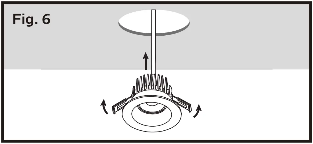 - Push spring loaded clips on the fixture upwards and insert fixture base into the mounting hole. Release the clips and fixture will be pulled flush to the ceiling. (Fig. 6)