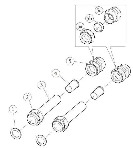 - Once the pipes are connected to the system, clamp the nut securely (5a) so that the copper pipe (3) and the fitting (5c) are sealed.