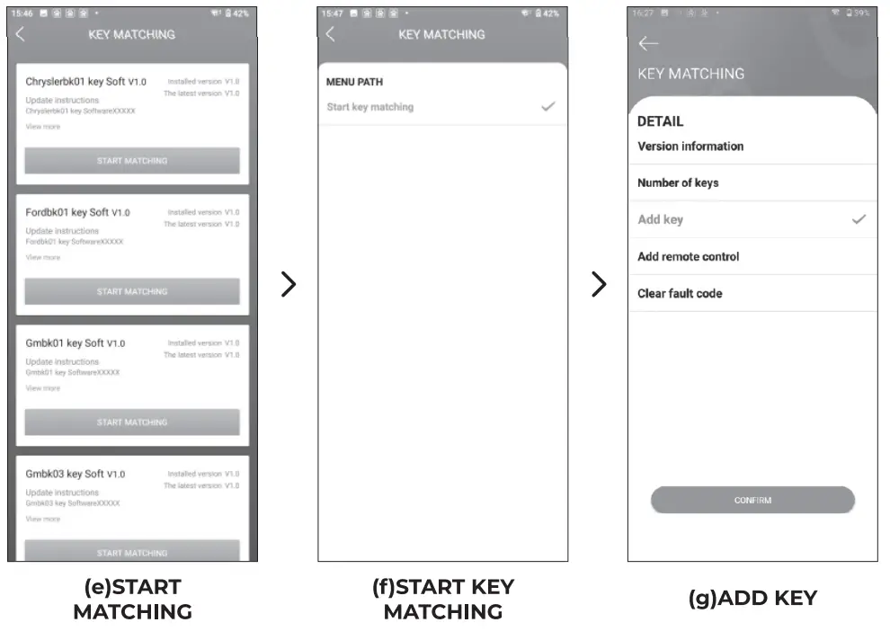 1) After you enter the KEY MATCHING page, tap DOWNLOAD to access the corresponding model software. Make sure that your network is available. 2) Tap (e)START MATCHING > (f)START KEY MATCHING > (g)ADD KEY and confirm.
