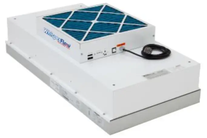 The Fan/Filter Unit is designed to fit on top of a Terra standard 2′ x 4′ clean room ceiling grid. It includes a threaded fixture at each corner to accommodate four eye-bolts (not provided) that can be used to assist in positioning the unit.