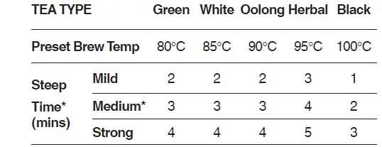 - Select the tea type by pressing the TEMP/KEEP WARM button. The tea type determines brew temperature and steep time, based on medium strength. The Sage Smart Tea Infuser™ has 5 preset tea types recommended for optimal brewing of Green, White, Oolong, Herbal, or Black tea.