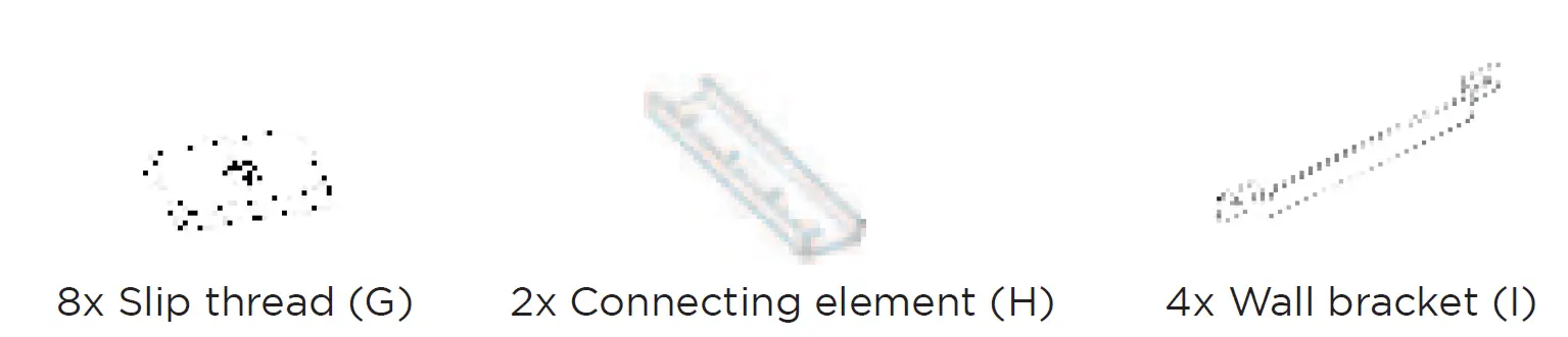- Screw the support strut(s) (L) and the wall suspension (I) to the slip threads (G) with the screws (J).