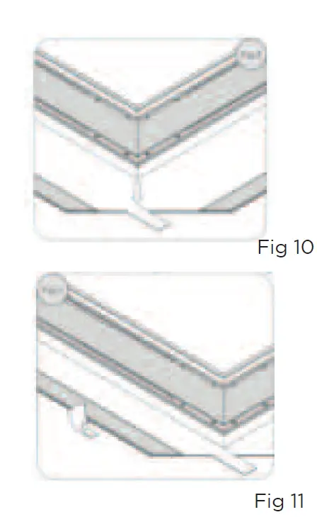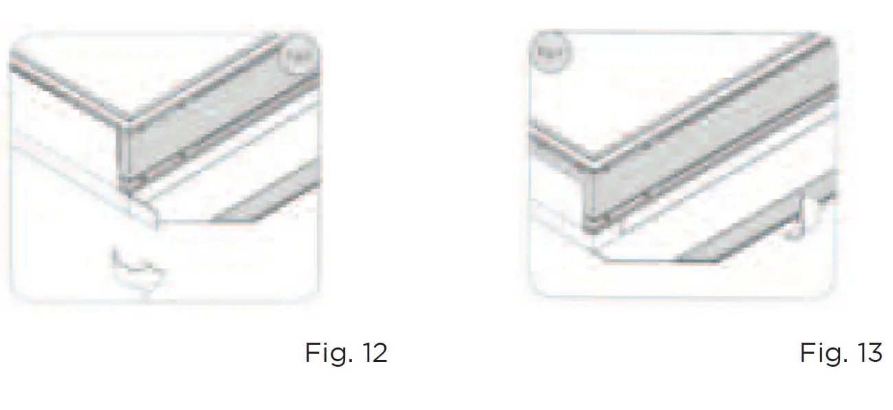 The fabric is correctly fi xed on the frame when the 4 corners lie exactly as shown in fi gs. 12 and 13, the fl ap is folded neatly over and the short side of the fabric covers it.