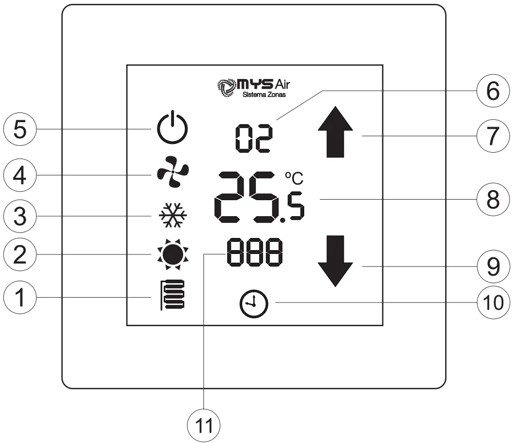 | 11 | ![]() | Thermostat off indicator, floor modein heat or cooling, timing andconfiguration mode. |