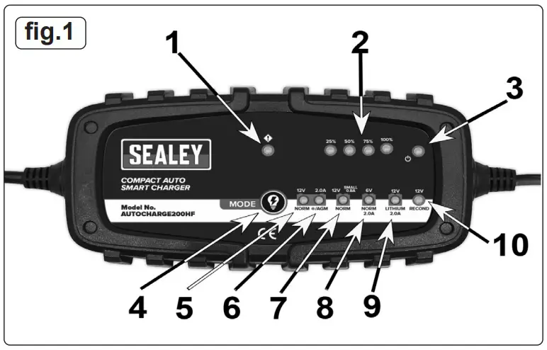 - Immediately the unit is powered on, cycle through charging mode options by depressing the Mode button (fig.1 Item 4). When the required option is highlighted hold the Mode key down for 5 seconds and required charging will begin. Charge level is indicated by the display LED sequence (fig.1 Item 2).