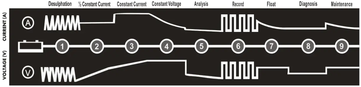 Stage 7: Battery charge to 100% capacity using constant voltage.