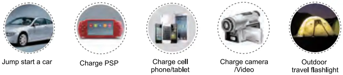 Apart from jump starting a car, this product can also supply power for a mobile phone, tablet, PSP, MP3/MP4, camera and other consumer electronics, and with different lighting modes.