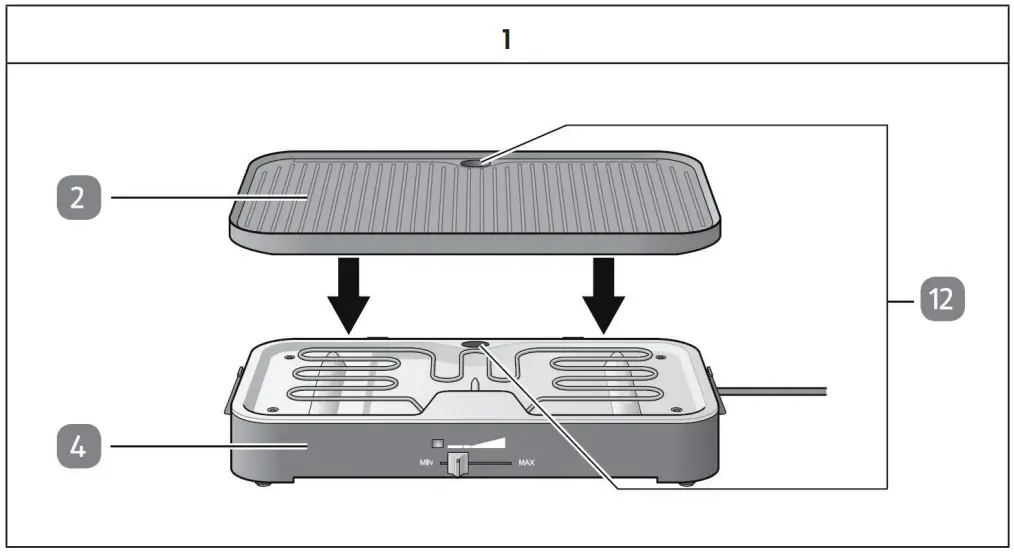 Note: Slide the thermostat control to the “MIN” setting be- fore you insert the mains plug in a socket with earth- ing contact. Do not use any fuels such as charcoal in the tabletop grill.
