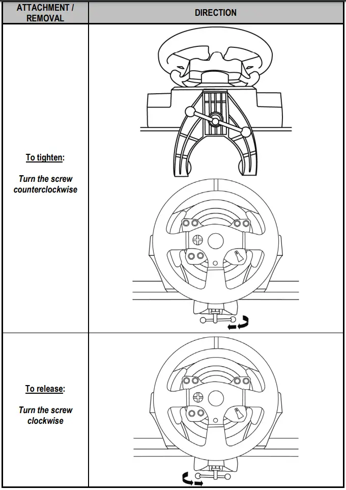 Align the connector locations using the arrows: Base (1) connector: Arrow pointing upwards. Racing wheel (2) connector: Arrow pointing upwards. Once the connectors are correctly positioned, simply rotate the Thrustmaster Quick Release (12) device’s ring counterclockwise, while holding the racing wheel (2) in position. Then, tighten the ring as much as you can; to do so, hold the ring in position and rotate the racing wheel clockwise.Once you have installed the wheel, rotate it 180° (when facing the wheel, the logo should be upside down) to access the small attachment screw located on the Thrustmaster Quick Release (12) device. Use a large cross-slot screwdriver to tighten the small attachment screw (do not use excessive force), turning it clockwise.