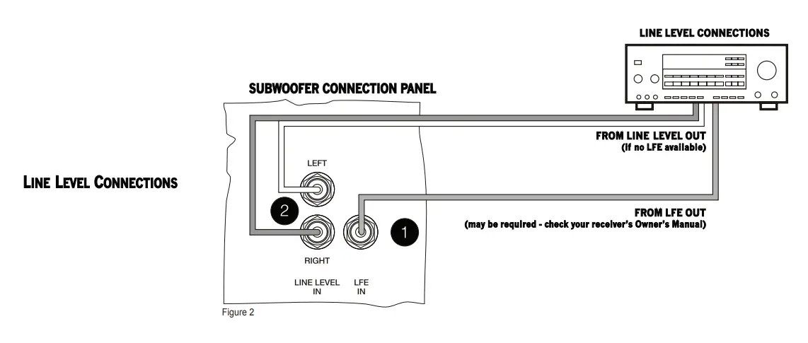Connect the LFE Output of an A/V receiver to the LFE Input (1) of the XLS subwoofer, or connect the left and right line level outputs of an AV receiver to the left and right Line Level Inputs (2) of the XLS subwoofer. (Figure 2). See your A/V receiver’s bass management instructions for proper integration into your system.