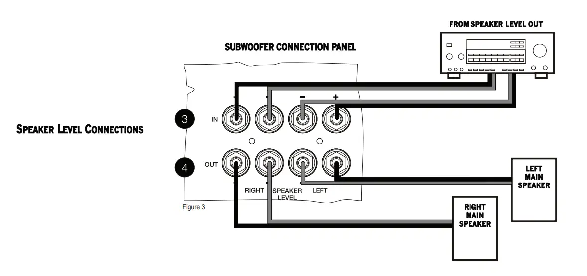 Then connect the Left and Right Speaker Level Outputs (4) of the XLS subwoofer to the left and right speakers on your system. Remember to maintain left to left, right to right, (+) to (+) and (-) to (-) connections. (Figure 3).