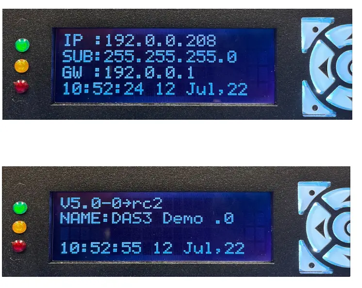 The front panel display currently shares information as “pages” with four lines of data. The fourth line always displays the currently set date and time. The pages may be cycled using the up and down arrows on the directional pad to the right of the display. The display automatically switches back to page one after a few seconds of inactivity.