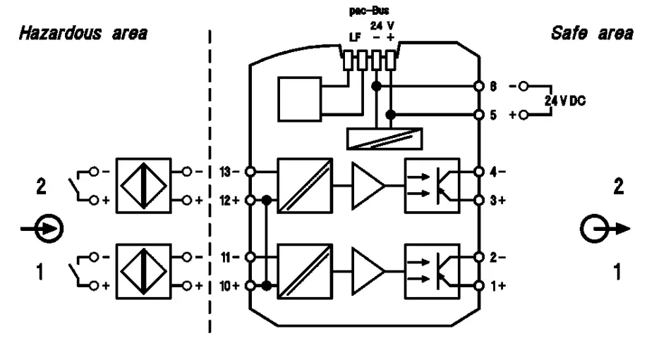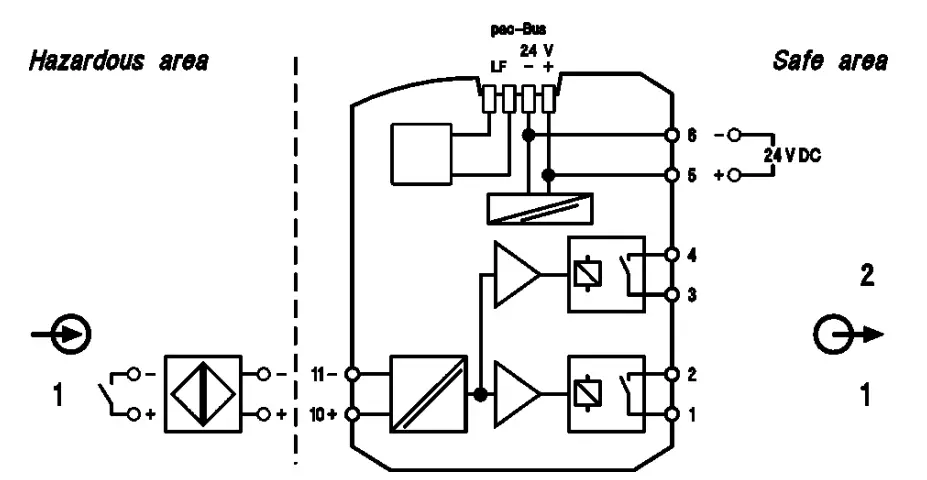 | Input signal NAMUR proximity sensors (IEC/EN 60947-5-6) Floating switch contacts Switch contacts with resistance circuit | Intrinsically safe |