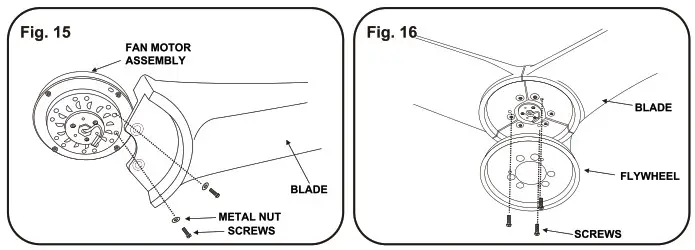 Step 1. Attach the fan blades to the fan motor assembly by using two blade screws (1/4″ x 20mm) and metal nuts. Tighten screws and metal nuts securely.(Fig. 15)