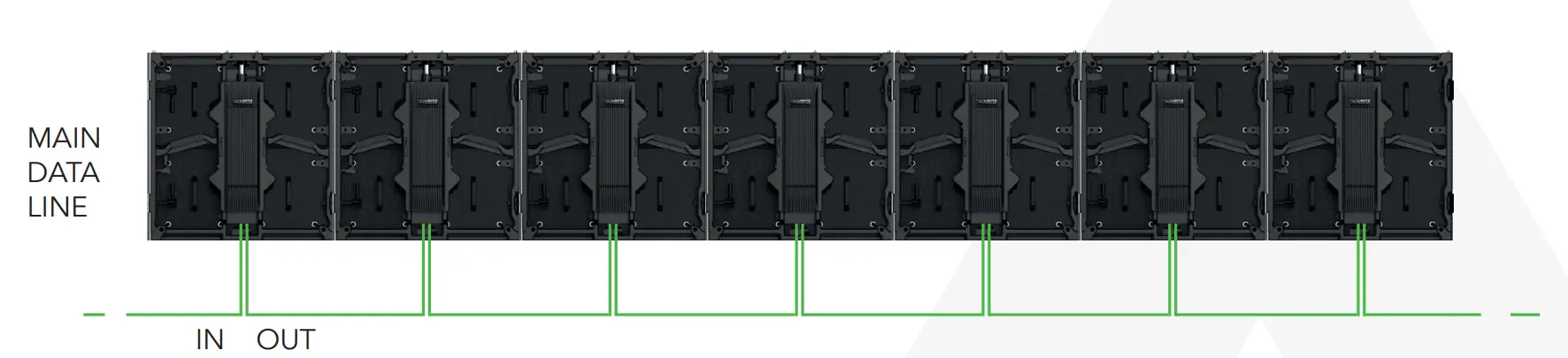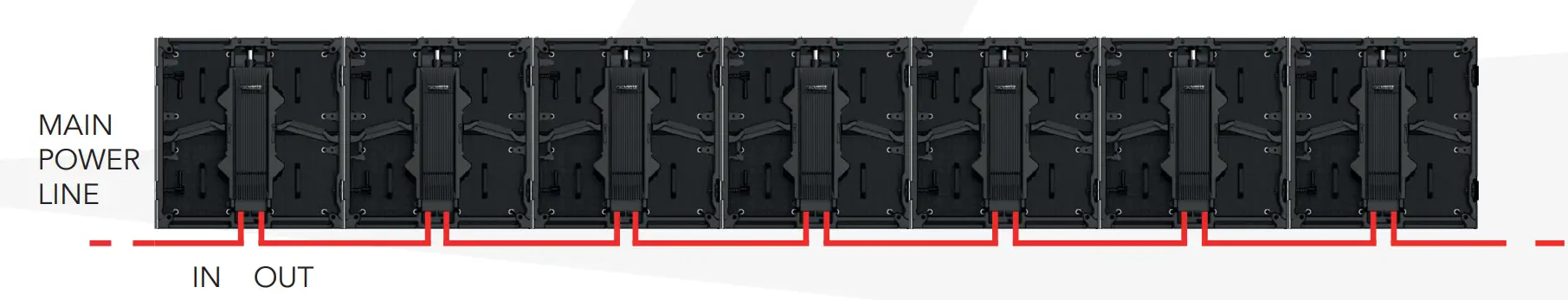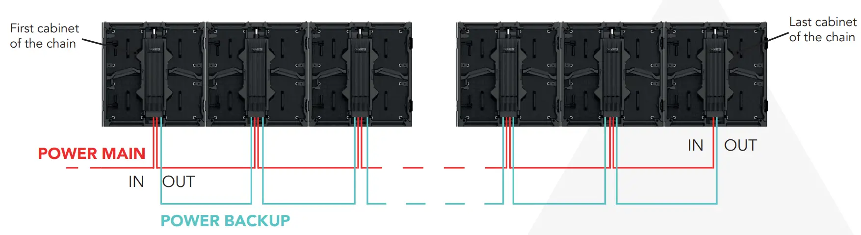 Each cabinet has an IN and OUT power connection (powercon true or powercon). It’s possible to connect in chain many cabinets. To design the power cabling, it’s necessary to know the max power consumption for each panel. It’s possible to see this info in the specifications of the product