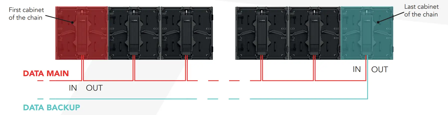 For all Prolights led screen cabinet it’s possible to install a MAIN data line and a BACKUP data line. This allows to see image on led screen in case of MAIN failure. MAIN and BACKUP need to be assigned from the PC software to the outputs of the processor.