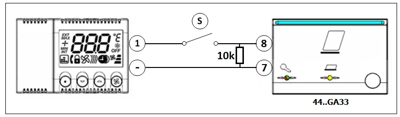 Although strongly discouraged because of the decay of available information for the room, it is possible to apply the configuration shown in figure 1b in case the room has, as presence device, a “key card switch” (Ave cod. 44..GA33 or others). In this case the status of occupied room is taken directly by the thermostat even if it is not possible to verify which type of card (guest, chambermaid or others) is inserted. How one can see from the scheme here under, to realize this configuration it is necessary to connect a resistor of 10kOhm / 0.25 W in parallel to the output terminals of the device key-card switch.