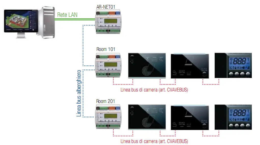 ARMBus: Room/Common Area bus line dedicated to the communication between the control units (cod. 53AR01-485 or cod. 53AR02-485) and the devices of room/common area (transponder readers and/or thermostats).