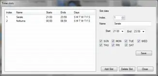 - Time slots must be define inside the day; timetables of slots whose hour of end (End) is lower than that of beginning (Start) are not admitted; a slot with “Start: 21:00 – End: 06.59 “is not valid. It’s however possible to divide a slot such as the one in the previous example in two slots: where the first is “Start: 21:00 – End: 23.59 and the second “Start: 00:00 – End: 06.59”. To activate an output from 21.00 in the evening till 7.00 in the morning it will be sufficient to associate it to both slots. ↑