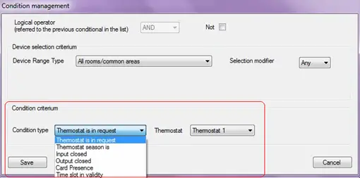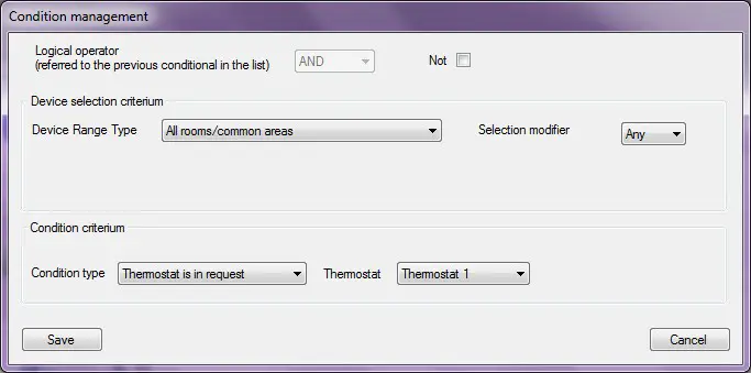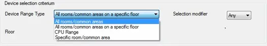 All rooms/Common areas: all the rooms or common areas of the plant. It is possible to choose (through the button “Selection modifier”) if the condition is verified only when the condition is verified by all CPUs (All) or from at least one of those present in the plant (Any).
